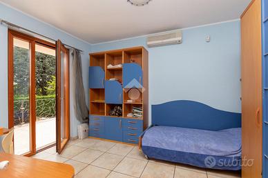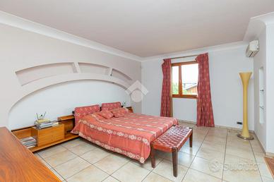 Nel cuore del Villaggio Aurora, villa di lusso libera su quattro lati unica nel suo genere con ampio parco privato di 1700 mq, con appartamento indipendente per personale di servizio e ampia autorimessa con sette posti auto. L'ingresso, dotato di ampie vetrate a tutta altezza, conduce al salone caratterizzato da una balconata circolare sita al piano superiore che affaccia sull' intera stanza in cui è stato costruito un camino a tutta altezza. Nella zona giorno sono presenti un'ampia cucina abitabile realizzata in muratura e legno con uscita sul patio coperto, una stanza adibita a dispensa, un locale servizio e una grande lavanderia. La zona notte del piano terreno è costituita da tre ampie camere da letto, un locale ripostiglio e due grandi bagni con doccia/ vasca ed è servita da un grande terrazzo . Un'ampia scalinata conduce alla grande camera padronale con terrazzo privato coperto accessoriata con locale spogliatoio, alla stanza da bagno con vasca idromassaggio e doccia posta al centro, allo studio e ad un' ampia zona solarium esposta a sud in piena privacy. Al piano interrato sono presenti un grande appartamento con ingresso indipendente, un'autorimessa con sette posti auto, un'intercapedine che protegge i muri del fabbricato e un zona caldaia separata, oltre a un ampia area parcheggio per sei automobili in piano fronte autorimessa. La casa è dotata di un impianto di riscaldamento a pavimento, impianto di aspirazione per le pulizie in ogni stanza, impianto di antifurto e sorveglianza, servizio di giardinaggio e pannelli solari. La soluzione viene affittata a clientela selezionata con referenze e si presta anche ad attività professionali consorziate come ad esempio studi medici associati. Non vengono prese in considerazione richieste per case famiglia e centri anziani.