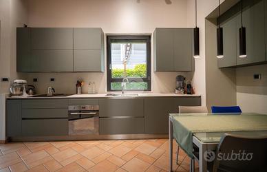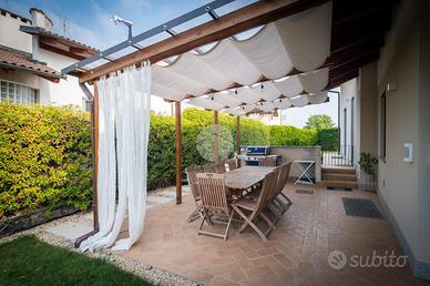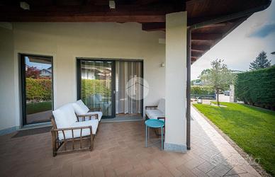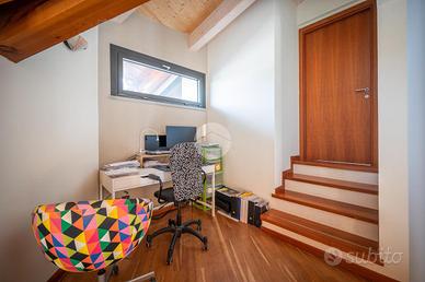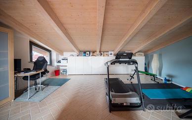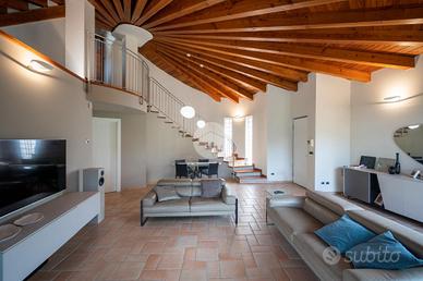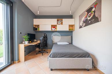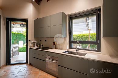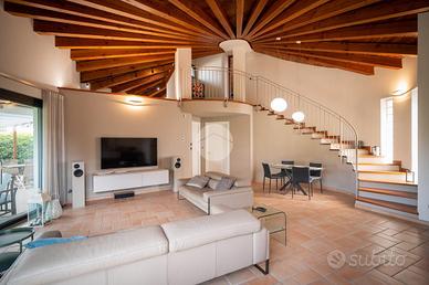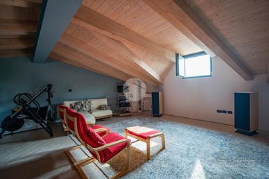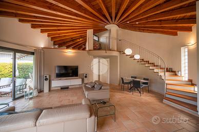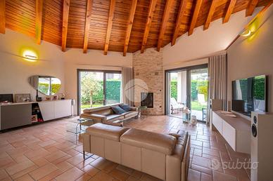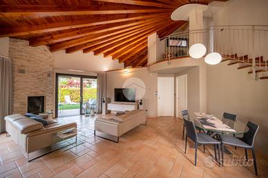 Nella splendida cornice del Villaggio Aurora, proponiamo in vendita un'elegante villa indipendente, sviluppata principalmente su un unico livello, soluzione ideale per chi desidera comfort, privacy e qualità abitativa. L'ingresso conduce a una zona giorno ampia e luminosa, valorizzata da grandi vetrate con affaccio diretto sul giardino e da un suggestivo camino a legna, perfetto per creare un'atmosfera calda e accogliente. Le travi a vista donano carattere e raffinatezza agli ambienti. La cucina, abitabile e funzionale, è perfetta per la quotidianità. La zona notte è composta due camere, una cameretta e doppi servizi: un bagno dotato di doccia e porta finestra con accesso diretto all'esterno, mentre il secondo, finestrato, è completo di doppio lavabo, doccia e vasca, offrendo il massimo comfort e funzionalità. Una elegante scala in ciliegio accompagna al piano mansardato, dove troviamo un ampio spazio versatile, ideale come zona ospiti, studio o area relax, anch'esso impreziosito da travi a vista e ottima luminosità. Al piano seminterrato, per metà fuori terra, si sviluppa una spaziosa taverna luminosa con accesso indipendente dall'esterno, oltre a una camera, lavanderia e bagno. Completa il piano un ampio box auto in grado di ospitare 3-4 auto La proprietà è circondata da un curato giardino sui quattro lati, con siepi che garantiscono massima privacy e tranquillità. L'immobile si presenta in condizioni impeccabili grazie agli importanti interventi effettuati nel 2023 che hanno garantito il raggiungimento della classe energetica A3. Il comfort abitativo è assicurato da un avanzato impianto integrato di riscaldamento, raffrescamento e produzione di acqua calda sanitaria, con riscaldamento a pavimento e pompa di calore con sistema di accumulo, che contribuisce ,in combinazione con l'elevato isolamento dell'edificio e con l'impianto fotovoltaico (12kW con accumulo da 32kW) all'elevata efficienza energetica che assicura bassissime spese di gestione. Infissi FINSTRAL ...