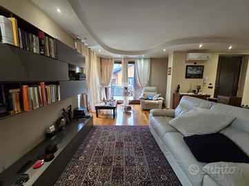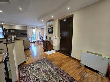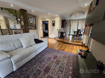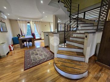 L'ingresso al piano terra si apre su un unico ambiente ampio e luminoso che accoglie un soggiorno doppio, una cucina abitabile con isola a vista e uno studio, il tutto valorizzato da una raffinata pavimentazione in parquet. Sempre su questo livello troviamo un bagno padronale dotato di doccia.