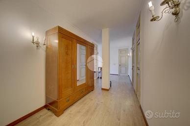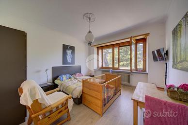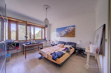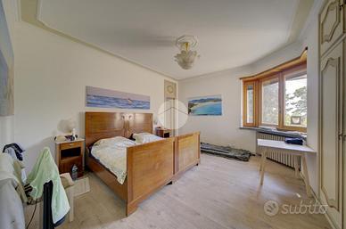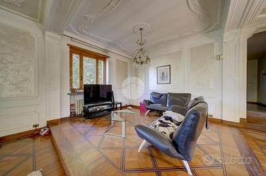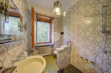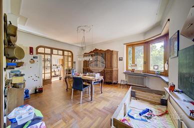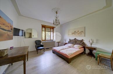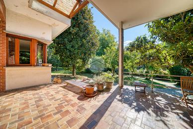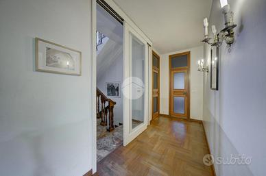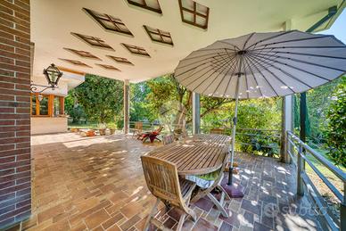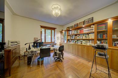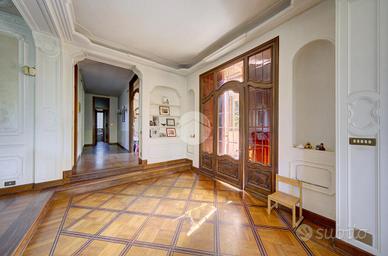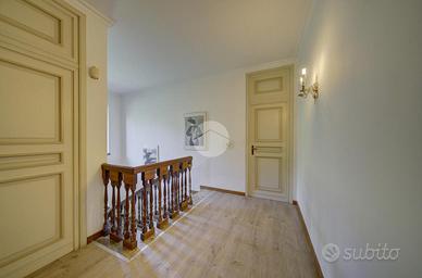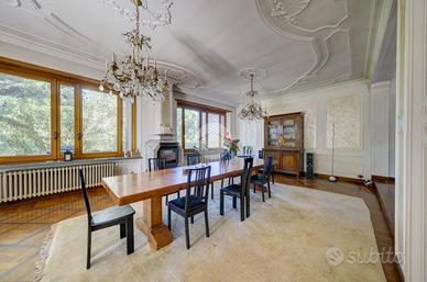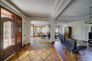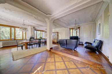 Strada Santa Maria: Immersa nel verde della collina Morenica di Rivoli, circondata da circa 3500 mq di giardino privato, ad una altitudine di circa 400 mt slm. nella privacy più assoluta, con un viale di ingresso riservato che si snoda tra gli alberi, sorge questa Villa in stile classico, ricca di dettagli raffinati. Salendo alcuni gradini ci si trova sul patio esterno, che circonda tutta la zona giorno. La porta di ingresso conduce direttamente al grande e luminosissimo salone, dotato di finestre e porte-finestre affacciate sul patio, oltre che di un particolare camino interno/esterno. Un disimpegno conduce ad un ampio studio, al soggiorno con cucina, al bagno del piano e ad un ripostiglio. Al piano superiore, quattro camere da letto, ognuna con il suo bagno en-suite. Al piano interrato, una tavernetta, autorimessa per 6/8 auto ed una grande cantina, oltre ad un locale di sgombero, .