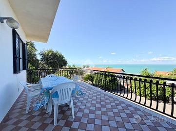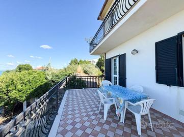 Il secondo appartamento, disposto su due livelli, ha un ingresso da scala esterna. Al primo piano trovi un soggiorno luminoso, una sala da pranzo con cucinotto e un grande terrazzo abitabile con vista mare, ideale per cene all'aperto o momenti di relax.