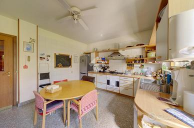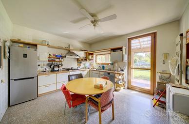 Completa la zona giorno, la cucina abitabile, molto spaziosa e anch'essa dotata di sfogo esterno sul giardino, passando da un terrazzino coperto da una tettoia e completo di cucina esterna (comoda per evitare odori in casa).