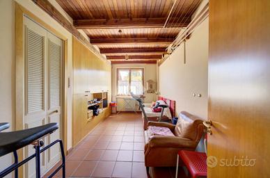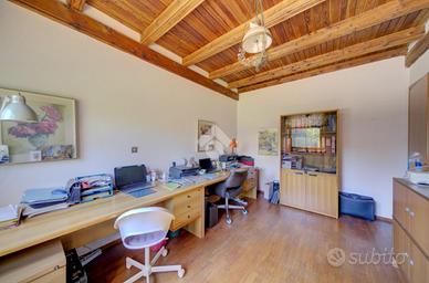 Al piano terreno ci accoglie un comodo ingresso su disimpegno, da cui accedere allo spogliatoio oppure direttamente allo splendido soggiorno doppio, dotato di camino a legna, soffitti molto alti con travi a vista e un particolare soppalco in legno. Dalle numerose porte finestre è possibile uscire direttamente sul giardino.