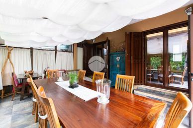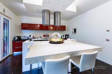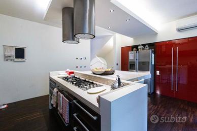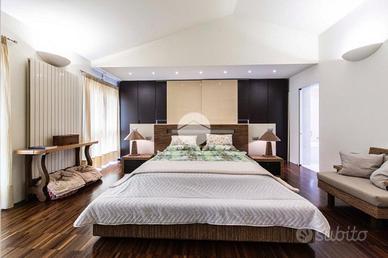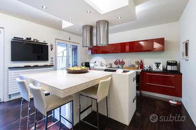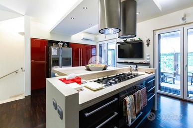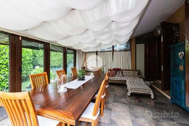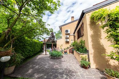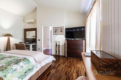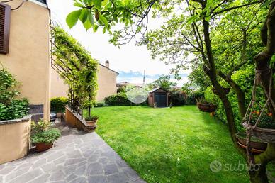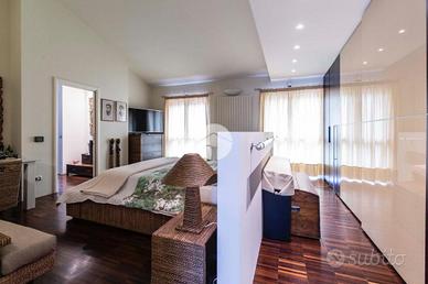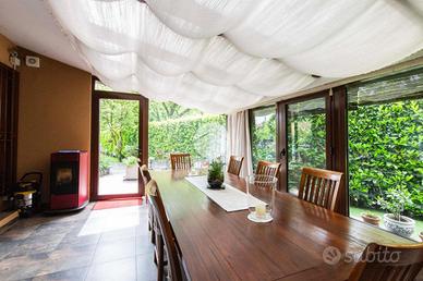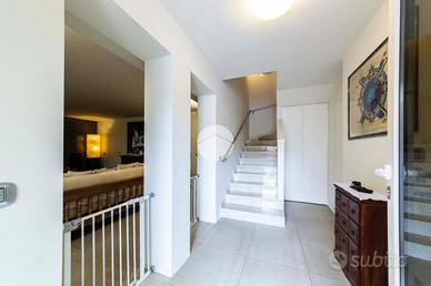 L'ingresso conduce al piano terra dove troviamo una luminosa zona giorno con la presenza di due ripostigli. Una raffinata scala in marmo conduce al piano superiore, dove troviamo una moderna cucina in stile americano con isola centrale, caratterizzata da due ampie porte finestre che si affacciano sull'elegante veranda. Quest'ultima, grazie alle generose dimensioni, offre molteplici possibilità di arredo, rendendola uno spazio ideale da vivere in ogni stagione, inoltre dà accesso allo splendido giardino privato, che si sviluppa su tre lati della proprietà, regalando un'oasi di tranquillità e riservatezza. Proseguendo, si accede alla zona notte, composta da una spaziosa camera padronale con bagno en-suitè finestrato, dotato sia di vasca che di box doccia.