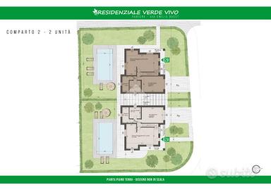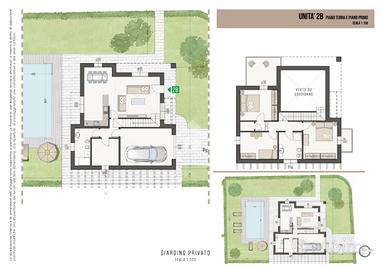 La villa si sviluppa su due livelli fuori terra e gode di ingresso indipendente con giardino privato su quattro lati, ideale per chi cerca privacy e spazi all'aperto da vivere in ogni stagione.