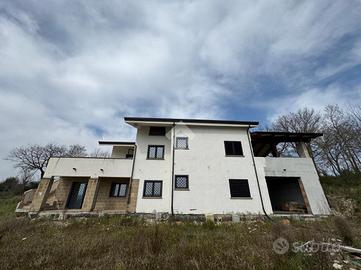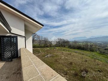 Nelle stupende colline tra Caiazzo e Ruviano, privato vende villa di nuova costruzione di circa 300 mq. con stupenda vista sui Monti del Matese e sulla valle caiatina. La villa sorge su un lotto di terreno di circa 6000 mq fronte strada, delimitato da piante di alto fusto tra cui diverse querce secolari, in zona panoramica non isolata considerata la presenza di diverse ville di pregio. Sul lato sud, grazie ad un'ampia vetrata ed un terrazzo di circa 60 mq, si può godere della vista dell'intera vallata mentre dal lato nord l'affaccio del balcone al piano mansardato è sul massiccio montuoso del Matese. La villa si sviluppa su tre piani ed è stata già predisposta per essere divisa in due appartamenti con ingressi indipendenti. Al piano terra abbiamo un patio con ingresso ed ampia vetrata, cucina - soggiorno, salone con camino, disimpegno, camera da letto, bagno e lavanderia. Al primo piano abbiamo un ingresso, salone con cucina a vista, due camere da letto molto ampie, bagno, lavanderia ed ampio terrazzo di circa 60 mq lato valle. Al piano mansardato abbiamo un disimpegno, tre camere da letto, bagno e balcone con vista lato monti. Completa la struttura, un'autorimessa di circa 50 mq.