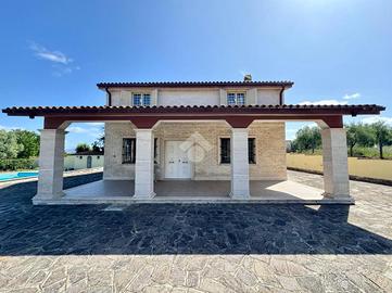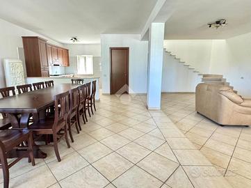 Proseguendo, è presente un comodo box auto. La villa principale si sviluppa su due livelli e si compone di una cucina anch'essa open space con soggiorno, e bagno di servizio. Al piano superiore, oltre al secondo bagno, troviamo quattro camere da letto spazione e luminose. Completano la proprietà una piscina interrata con un locale spogliatoio con bagno.