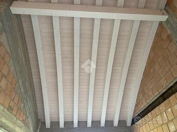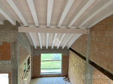 la villa ha una copertura con tetto lamellare ventilato laccato bianco, mentre le pareti hanno un cappotto di rivestimento;