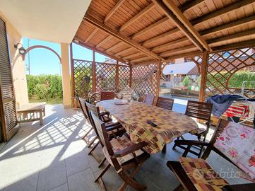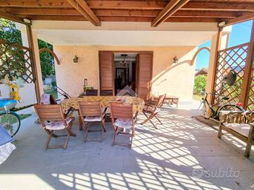 Il giardino che circonda l'intera casa è dotato anche di un ampio porticato piastrellato.