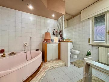 Dalla zona pranzo una scala interna conduce al piano superiore, dove è presente un'area aperta adibita a studio, affacciata sul vano scala e con accesso a un balcone. La zona notte comprende tre camere da letto, di cui una matrimoniale particolarmente ampia e due camere doppie, oltre a un secondo bagno finestrato con doccia e a un comodo ripostiglio.