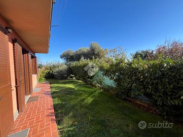 Il giardino circonda la proprietà ed è presente anche un comodo porticato coperto e piastrellato dotato di punto luce, ideale per essere utilizzato e vissuto nella bella stagione.