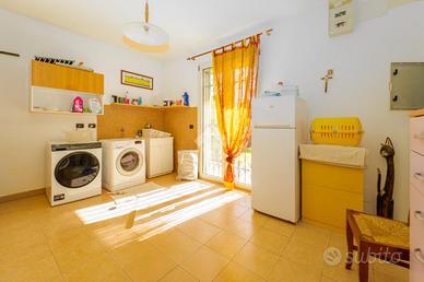 Tramite il disimpegno accediamo ad un bagno finestrato con box doccia, ad una comoda lavanderia di 16 mq e al garage di 19 mq.