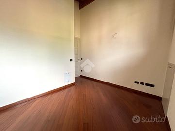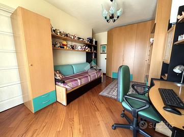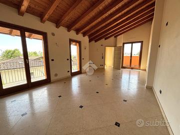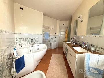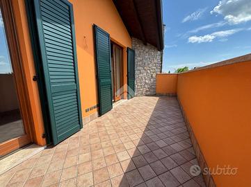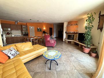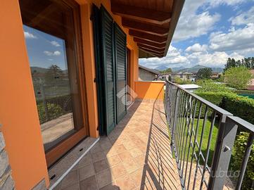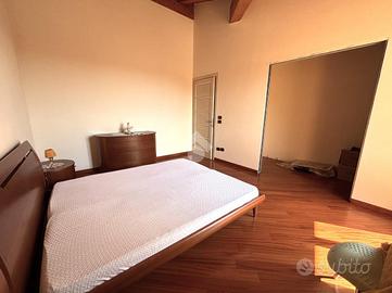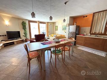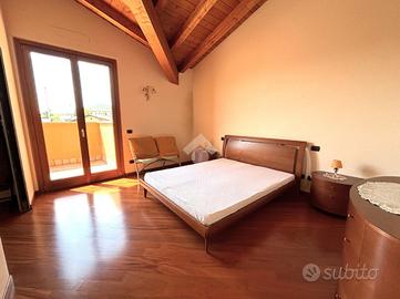 Al primo piano, impreziosito da travi a vista, si trova un secondo appartamento con luminoso soggiorno e zona cucina con balcone e terrazzino, un bagno, una camera matrimoniale con cabina armadio e una camera singola, offrendo ambienti spaziosi e confortevoli ideali per il relax quotidiano.
