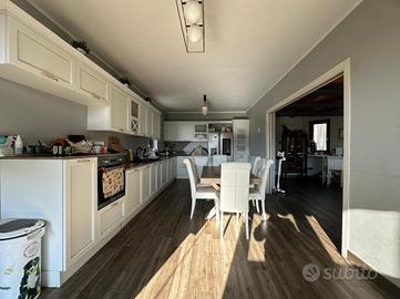 Adiacente al soggiorno si trova la grande cucina abitabile, anch'essa luminosa e dotata di una porta finestra che permette l'accesso diretto al giardino esterno, perfetto per momenti di convivialità all'aperto.