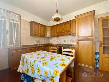 Un secondo ingresso accompagna all'abitazione dalle metrature più ampie, che si sviluppa su due livelli. Il piano rialzato, adibito alla zona giorno, ci accoglie uno spazioso soggiorno - pranzo con cucina abitabile separata, arricchita da un pratico affaccio sul ballatoio d'ingresso.