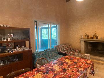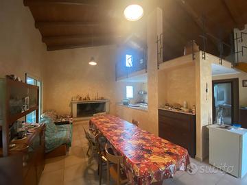 ampia zona giorno con angolo cottura a vista e grande camino; le volte si presentano molto alte, con travi di castagno a vista. Al piano sono presenti due camere da letto ed il bagno; inoltre è presente collegato al soggiorno tramite una scala in legno un soppalco grande in cui poter usufruire di un ulteriore stanza da letto. All'interno della proprietà vi è una cantina molto spaziosa. Completa la proprietà un accogliente veranda esposta sulla zona giorno, in parte coperta con vetrate.