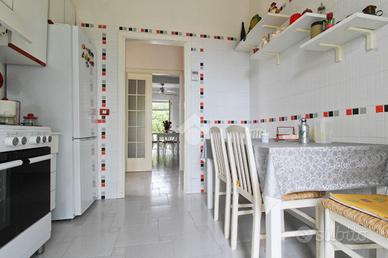 L'ingresso sul dispimpegno conduce alla cucina con ripostiglio e accesso tramite balcone alla veranda e al giardino sul retro.