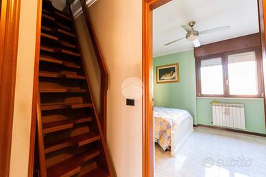 Segue, con medesima esposizione, il primo bagno finestrato. Tramite scala interna, collocata in sala, accediamo al secondo livello, attualmente adibito a zona notte, dove ad accoglierci troviamo due camere da letto di cui una finestrata ed una con accesso al secondo grande terrazzo vivibile della casa ed il bagno patro