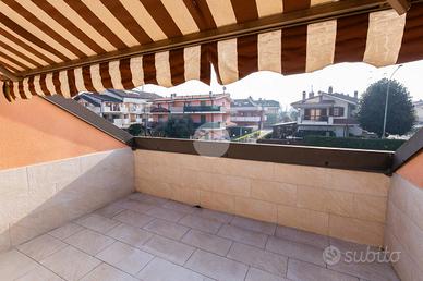 L'accesso in casa, lo si ha nell'ampio soggiorno, dal quale accediamo, tramite un piccolo disimpegno, alla cucina abitabile con porta finestra che ci porta al primo comodo terrazzo della casa, grande al punto tale da poterci collocare un tavolo con delle sedie, con esposizione opposta rispetto alla sala.