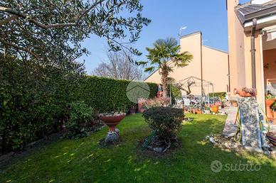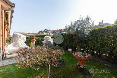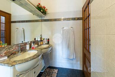 Gli spazi complessivi della dimora, sono distribuiti su tre piani fuori terra ed uno seminterrato. L'ingresso lo abbiamo tramite l'ampio giardino privato, che sviluppandosi in maniera regolare sia in lunghezza che in larghezza, dà la possibilità di poter collocare diverse soluzioni d'arredo al fine di poter sfruttare a pieno questo spazio, che può essere sfruttato come una vera e propria estensione all'aperto della zona giorno, grazie anche alla presenza di piante ad alto fusto che lo circondano e che quindi conferiscono privacy e riservatezza.