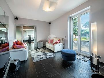 La corte esterna ci conduce fino alla porta di ingresso, che si apre su un luminoso e ampio soggiorno con camino di design, sala da pranzo, sala hoppy con bagno finestrato con vasca, una grande dispensa e la cucina abitabile con uscita sulla zona barbecue.