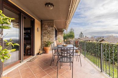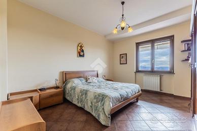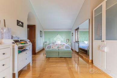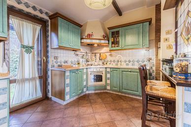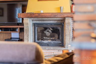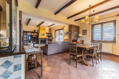 La zona giorno, al piano terra, si compone di un ampio salone con camino, zona divani e tavolo da pranzo, con uscita diretta sul portico dotato di tende da sole. Sullo stesso livello troviamo la cucina in muratura, funzionale e ben organizzata, e una camera matrimoniale con bagno, con spazi ben distribuiti.