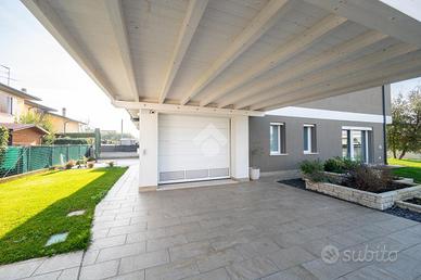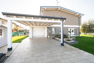 Esternamente, il giardino circonda l'intera abitazione, garantendo privacy, vivibilità e ampie possibilità di personalizzazione degli spazi outdoor. L'accesso carraio automatizzato posto sul fianco della proprietà assicura praticità e sicurezza, mentre sul retro è presente una casetta in legno per il ricovero degli attrezzi e una tettoia. L'area cortiliva è servita da impianto di irrigazione e illuminazione esterna, elementi che valorizzano ulteriormente l'abitazione anche nelle ore serali e tendaggio automatizzato.