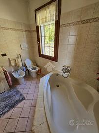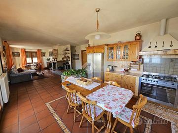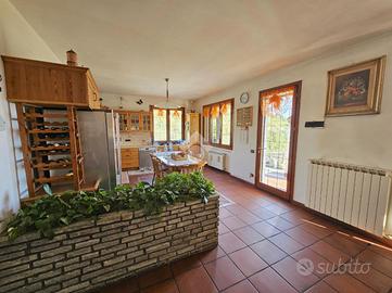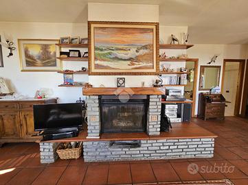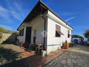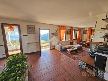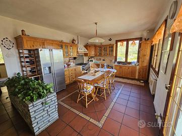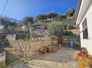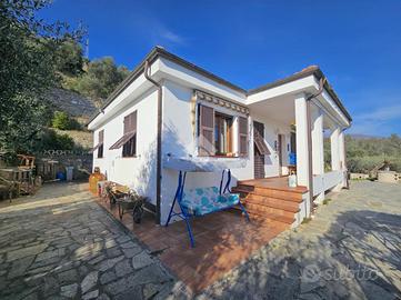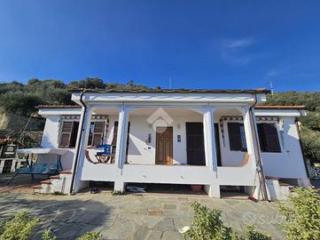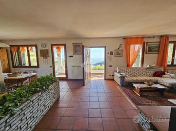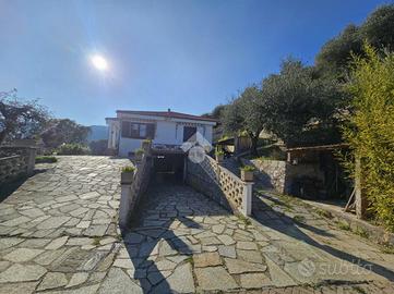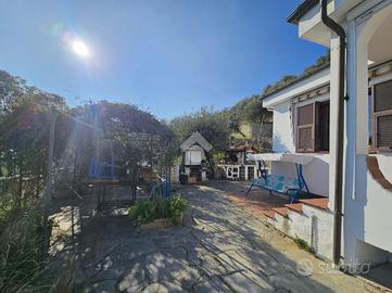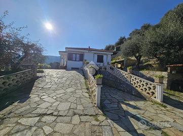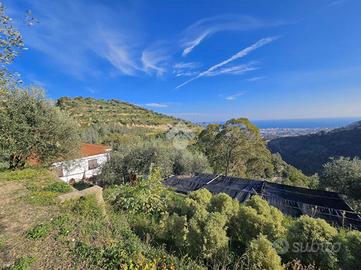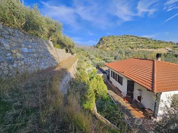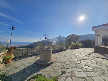 TAGGIA - VILLA IN PRIMA COLLINA Ci troviamo in prima collina, precisamente in Regione Sorini, in un contesto signorile silenzioso e immerso nel verde, a 10 min di auto da Arma. La villa è disposta su due livelli: - al piano inferiore troviamo il garage di circa 100 mq con bagno; - al piano superiore troviamo l'abitazione che misura circa 140 mq, composta da ingresso in open space su un ampio e luminoso salone con angolo cottura, tre camere da letto, doppi servizi. La proprietà è contornata da circa 8000 mt di terreno, in parte frutteto e in parte uliveto. Internamente lo stato conservativo è ottimo, abitabile da subito. Esposizione ottimale a sud, con vista mare panoramica. La casa è riscaldata tramite il camino a legna collegato ai caloriferi, mentre acqua e cucina sono alimentati da serbatoio gpl.