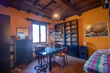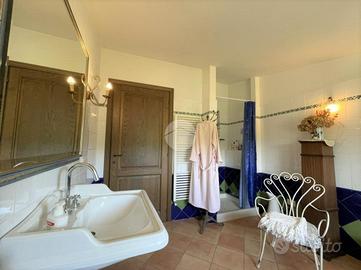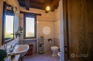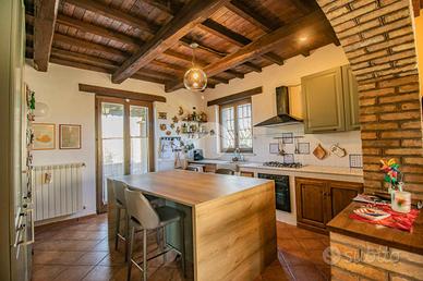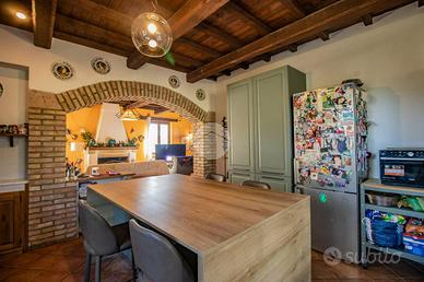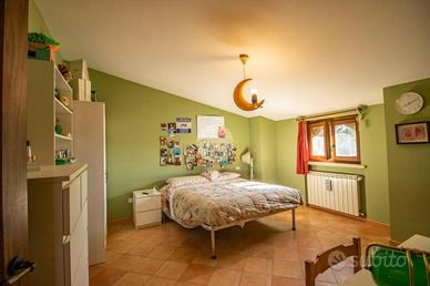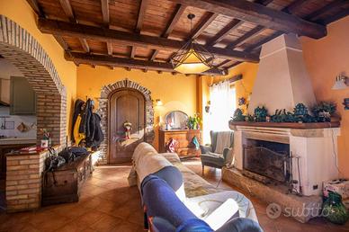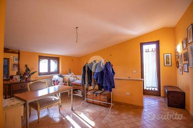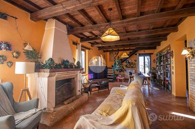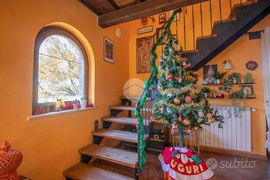 La proprietà si sviluppa su tre livelli, il piano terra è composto da un soggiorno di 50 mq con camino e portico, cucina abitabile con portico, camera matrimoniale e bagno con doccia. La finiture interne di questo ambiente sono caratteristiche grazie alle travi in castagno e la scala in ferro battuto; il piano primo ha una zona living con terrazzo, tre camere matrimoniali, ampio bagno con vasca e doccia e ripostiglio.