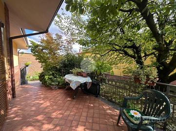 Completano la proprietà un ampio piano terra con quattro box auto e una cantina. Il giardino circostante offre uno spazio ideale per momenti di relax all'aperto.