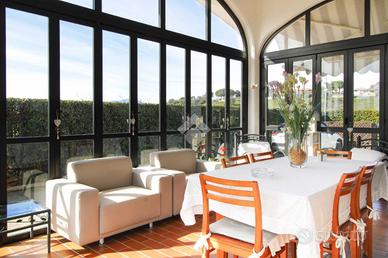 Dalla sala da pranzo e dalla cucina si accede direttamente a una splendida veranda affacciata sul giardino, un luogo incantevole dove godersi colazioni al sole, cene estive o semplicemente il piacere della quiete, immersi nei profumi e nei colori della natura.