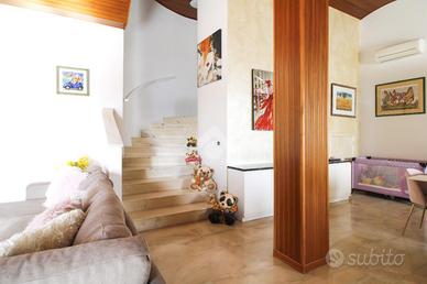 Dal soggiorno, una scala scenografica di grande impatto architettonico conduce al piano superiore, dedicato alla zona notte.