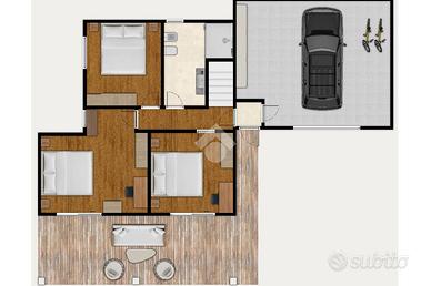 Il progetto prevede una casa indipendente sviluppata su due livelli, dove al piano terra si trova la zona notte composta da tre camere da letto, con sfogo sul portico, un bagno finestrato ed un box auto.