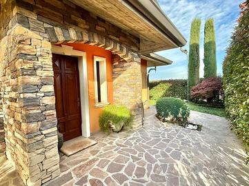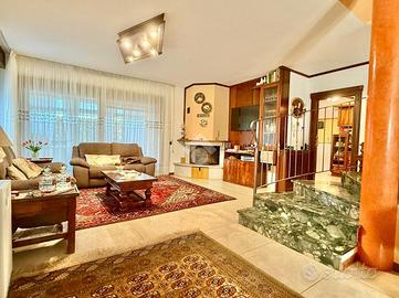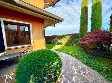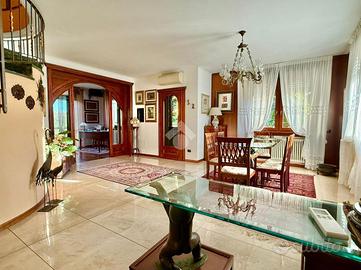 TREVIGLIO Zona residenziale: In ottimo contesto residenziale immerso nel verde moltro tranquillo e riservato, comodo per il centro storico cittadino e ai suoi molteplici servizi quali stazioni Fs, scuole, centri commerciali, farmacie e altri negozi di primissima necessità, proponiamo elegante villa singola edificata nel 2005 di circa 260 mq abitativi, sviluppati su due piani, oltre ad ampia taverna rifinita, lavanderia, cantina, box quadruplo in larghezza, veranda bioclimatica di 40 mq e giardino privato piantumato di oltre 300 mq. Al piano terra ingresso sul grande soggiorno luminoso di 70 mq dotato di camino, studio di 14 mq ideale per lavorare in 'smart working', cucina abitabile di 17 mq, bagno e veranda attrezzata di 40 mq che si affaccia sul bellissimo giardino piantumato di circa 300 mq; al piano primo tre camere da letto, ampio bagno padronale, locale relax di 25 mq e terrazzo di 30 mq; al piano interrato taverna rifinita di 60 mq con camino, lavanderia attrezzata, cantina e box quadruplo di 67 mq in larghezza.