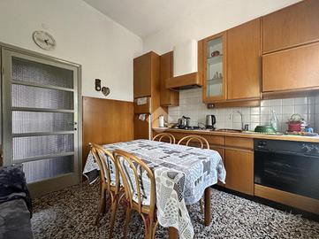 L'abitazione, disposta su un unico livello, è composta da tre locali e suddivisa in ingresso da scala e portico esterni, soggiorno, cucina abitabile con porta finestra ed accesso diretto al giardino, due camere matrimoniali e bagno finestrato con doccia. La scala interna collega al piano cantina che si compone di tre ambienti separati ed accesso diretto al box ad uso autorimessa.