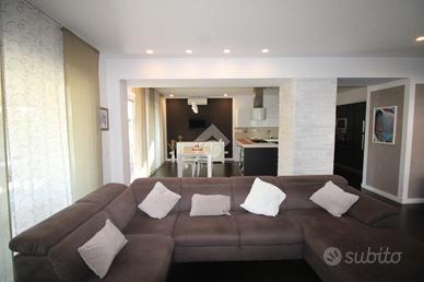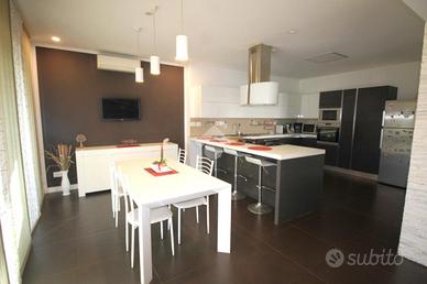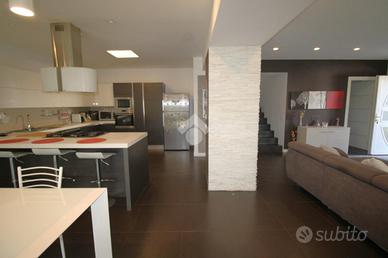 Al piano terreno si apre un ampio open space con grandi vetrate che donano luce e continuità tra interno ed esterno. La zona living, con angolo TV e area relax, si integra perfettamente con la cucina moderna con penisola e tavolo da pranzo, creando un ambiente elegante e funzionale. Dal soggiorno si accede al patio esterno, ideale per momenti di convivialità e relax, già predisposto per una cucina outdoor.