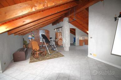 Il piano superiore ospita un ampio sottotetto mansardato con travi a vista in legno, impreziosito da due velux che donano grande luminosità naturale agli spazi. Un ambiente caldo e accogliente, ideale come zona studio, area relax o ulteriori camere, con la possibilità di realizzare un terzo bagno secondo le proprie esigenze.