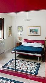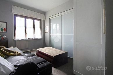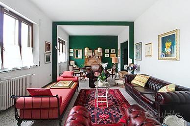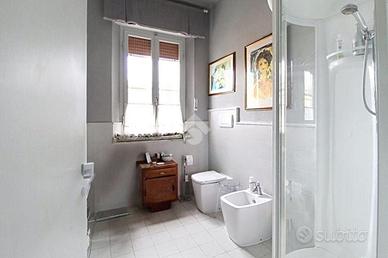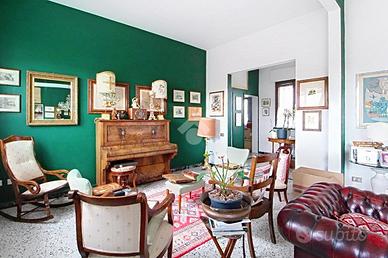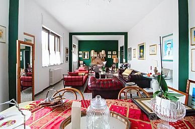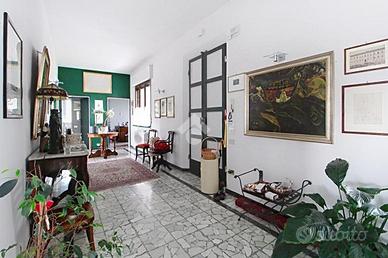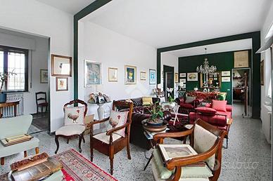 Al primo piano, accessibile tramite una doppia scala esterna che conduce alla terrazza abitabile, troviamo un grande disimpegno che accompagna al triplo soggiorno. Proseguendo, si trova una cucina abitabile, due camere matrimoniali (di cui una con cabina armadio), uno studio e doppi servizi completi di box doccia e finestra. Questo appartamento è stato ristrutturato nei primi anni 2000.