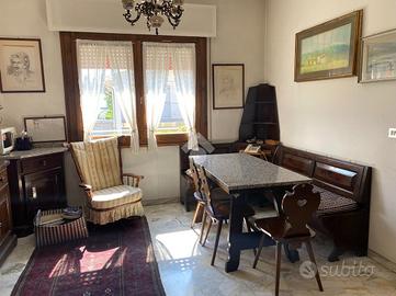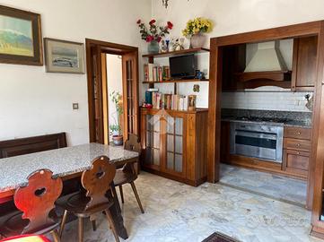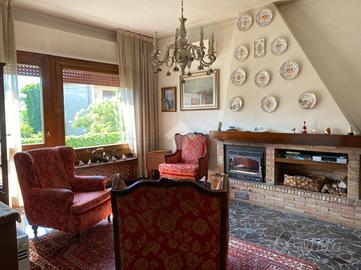 Attraverso una scala esterna, grazie a una gradinata adornata da edera, si accede al primo piano, dove si apre una splendida terrazza abitabile esposta a est, perfetta per godere della colazione o di pasti all'aperto durante la bella stagione. L'ingresso porta alla zona giorno, composta da un luminoso soggiorno con caminetto e da una cucina separata con cucinotto, collegata internamente al piano terra da una scala dotata di montascale per persone con difficoltà motorie.
