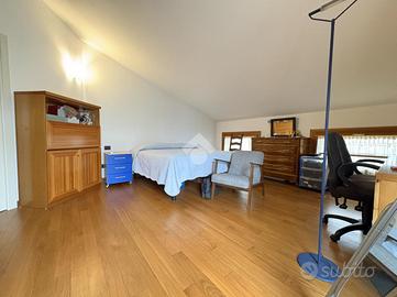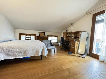 Il livello superiore ospita ulteriori locali mansardati, sfruttabili come camere, studio o zona hobby, oltre a bagno e spazi accessori sottotetto. Presente poggiolo con affaccio esterno, che garantisce luce naturale e sfogo visivo.