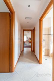 Raggiungendo il reparto notte, sempre al piano terra, troviamo il corridoio che ci conduce alle due camere da letto, di cui una matrimoniale di 16,40 mq, una doppia di 12,15 mq e bagno finestrato.