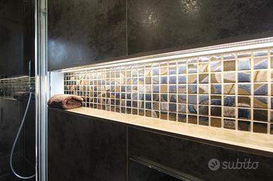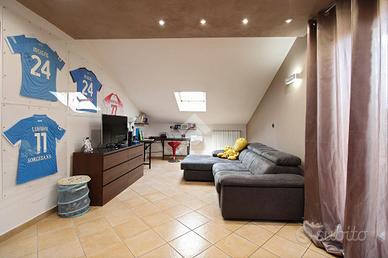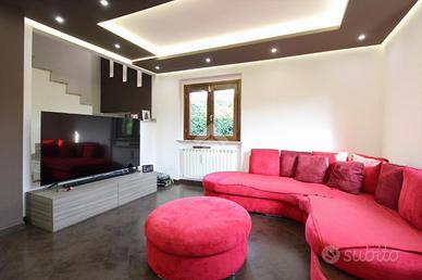Al piano terra troviamo l'ingresso sull'ampio soggiorno, suddiviso in una zona relax e una zona pranzo, caratterizzato da una raffinata controsoffittatura con illuminazione a faretti e led, che consente di scegliere la zona da illuminare oltre che a dare la possibilità di scegliere se accendere le luci a faretto, a led o entrambe contemporaneamente. Completa il piano la cucina abitabile, la camera da letto matrimoniale con sfogo sul giardino ed il bagno con box doccia a pavimento.
