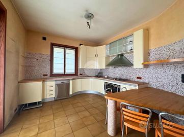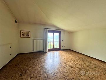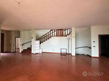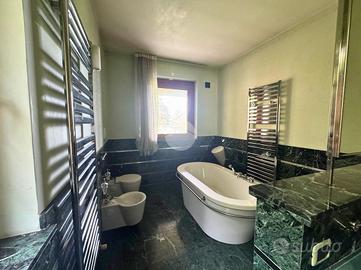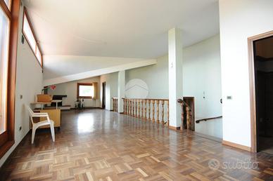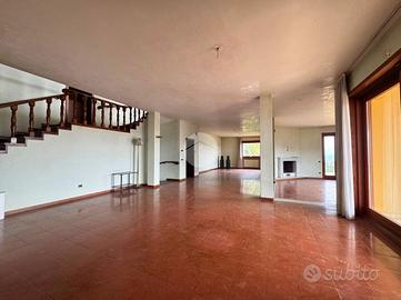 L'ingresso conduce in un ampio salone a doppia altezza, con scenografica scala, camino in stile primo Novecento e grandi vetrate che incorniciano il panorama. La cucina abitabile si apre su un portico coperto, perfetto per pranzi all'aperto in ogni stagione.