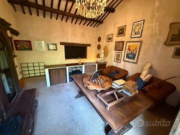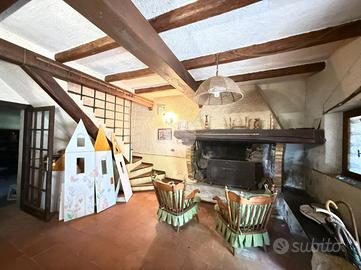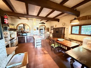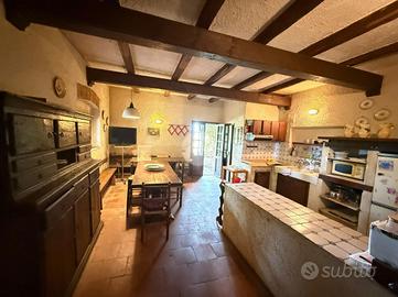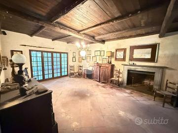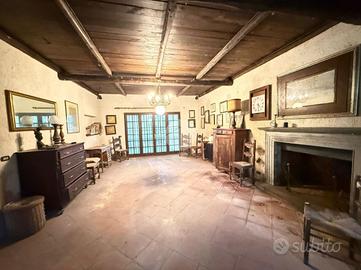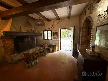 Entrando al piano terra veniamo accolti da un tinello con un meraviglio camino, con adiacente un doppio salone con una altro camino centrale alla stanza, con uscita su un ampio portico; adiacente al salone è presente una grande cucina abitabile, anch' essa con uscita sul giardino, ed un piccolo bagno.