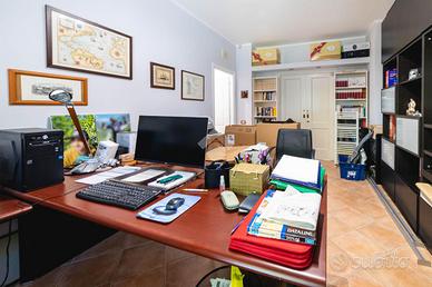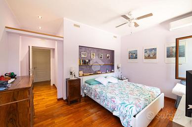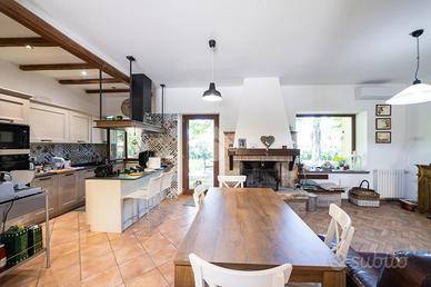 All'ingresso veniamo accolti da un bella zona giorno con sala da pranzo con camino in pietra e con cucina a vista con penisola. Da questo ambiente si accede al retro della villa dove in estate poter pranzare e cenare riparati dagli alberi che schermano il calore. Nelle immediate adiacenze incontriamo un soggiorno molto ampio di forma regolare con affacci sul patio esterno. Comunicante con esso un elegante studio/camera matrimoniale e un bagno finestrato a servizio della zona giorno vanno a completare questa ala sinistra della proprietà.