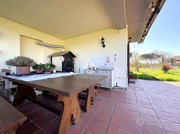 In Str. Piscin di Polvere proponiamo soluzione indipendente in ottimo stato circondata dal verde ma vicino al quartiere Santa Barbara-Capretta. Entrando nella proprietà troviamo un portico coperto che ci immette nel soggiorno, una cucina separata con uscita al secondo portico coperto comodo per pranzi e cene all'aperto. Al piano superiore troviamo tutta la zona notte composta da due camere matrimoniali, due camere doppie, due bagni ristrutturati uno con vasca e uno con doccia, una camera singola con accesso al primo terrazzo di 23mq e una seconda camera singola attualmente disposta a lavanderia ma con gli attacchi presenti per una seconda cucina e l'uscita sul secondo terrazzo sempre di 23 mq. Completano la proprietà un box auto doppio di 43 mq e una cantina finestrata di 40mq. L'intera proprietà è completamente recintata ha uno spazio esterno di circa un ettaro. Riscaldamento caldaia, camino, stufa a pellet idro e condizionatori caldo-freddo.