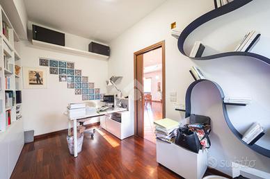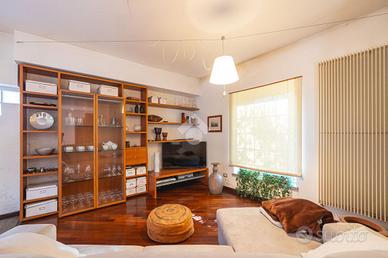 Si accede al piano terra tramite un giardinetto che si estende fino a diventare terrazzo da sfruttare come zona solarium o area barbecue. Qui troviamo: zona living open space con cucina a vista, camino, uscita sul terrazzo e studio. Tre camere da letto, una matrimoniale e due singole di buona metratura, due bagni finestrati e un armadio a muro comodissimo. Tutto il piano è rivestito in parquet, è stato ristrutturato nel 2000 ed è servito da un'idrostufa.