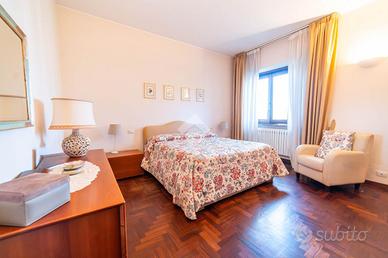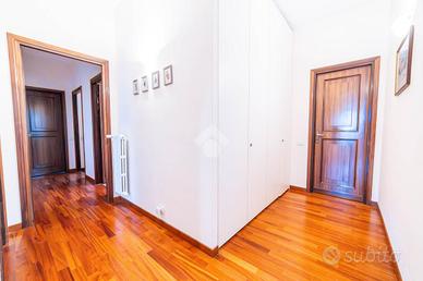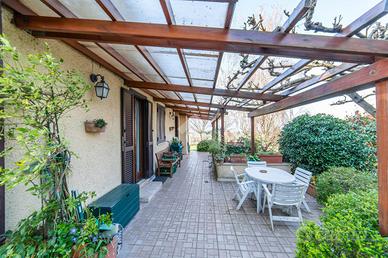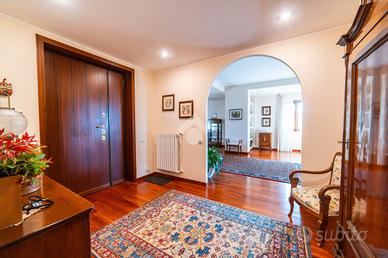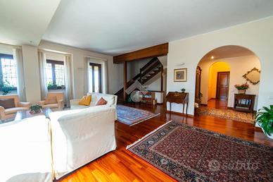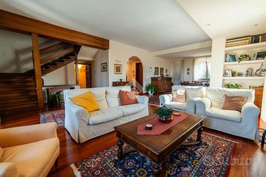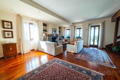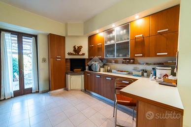 Il piano terra accoglie con un ampio soggiorno luminosissimo, arricchito da grandi finestre e camino, che crea un'atmosfera elegante e rilassante. La cucina abitabile, anch'essa con camino, si apre direttamente sul portico esterno, uno spazio ideale per pranzi e cene all'aperto immersi nel verde. Completano il piano una camera matrimoniale, uno studio e due bagni finestrati.