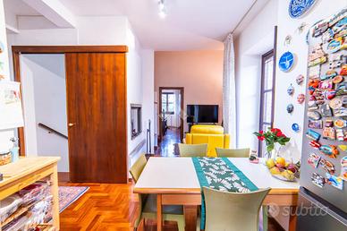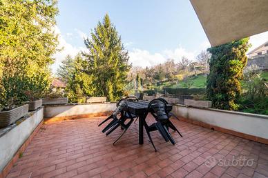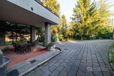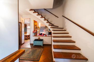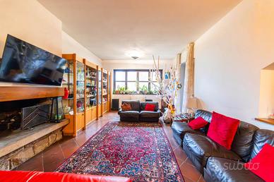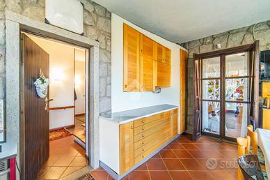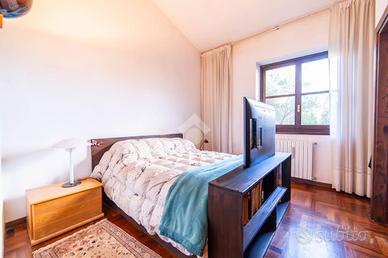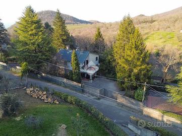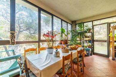 VILLA SINGOLA IMMERSA NEL VERDE - STRADA ROMANA, BAGNAIA In posizione riservata e tranquilla, immersa nella natura, proponiamo in vendita una splendida villa singola circondata da circa 5.000 mq di terreno privato con castagneto, ideale per chi desidera privacy, ampi spazi e qualità della vita. La proprietà è completamente recintata e dotata di cancello elettrico e sistema di videosorveglianza, garantendo sicurezza e serenità in ogni momento. La villa si sviluppa su tre livelli, caratterizzati da ambienti ampi, luminosi e ben distribuiti. Al piano terra si viene accolti da un ingresso vetrato con stufa a pellet, che introduce alla zona giorno composta da una cucina abitabile con camino e accesso diretto al portico esterno, perfetto per pranzi e momenti di relax all'aperto. Completa il piano un doppio salone molto luminoso, anch'esso dotato di stufa a pellet e camino, oltre a un bagno finestrato. La pavimentazione in cotto contribuisce a creare un'atmosfera calda e accogliente. Il piano primo, rifinito in parquet, ospita una seconda zona giorno con cucina e soggiornino arricchito da termocamino Vulcano, con accesso a una terrazza di circa 20 mq dotata di pratico montacarichi per la legna. La zona notte comprende due camere da letto, di cui una con bagno privato, un ulteriore bagno, uno studio e una comoda lavanderia dove si trova la caldaia di recente installazione. Il piano mansardato è dedicato al relax e alla privacy, con una zona living, una camera da letto con bagno privato e un ampio ripostiglio. A completare la proprietà un garage di generose dimensioni e il terreno circostante, che offre spazi ideali per vivere all'aperto in totale tranquillità. La villa è dotata di infissi in legno con doppio vetro, riscaldamento con termosifoni integrato da stufe a pellet e camini, alimentazione a gas con bombolone, portelloni in vassello, acqua da pozzo con autoclave e impianto di irrigazione con serbatoio da 2.000 litri. Il tetto e i discendenti sono in rame. Pres