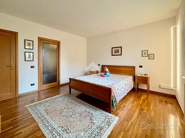 La zona notte, ben separata, è caratterizzata da pavimenti in parquet e comprende tre camere da letto, di cui una matrimoniale con cabina armadio, oltre a un bagno principale.